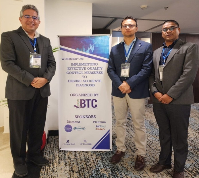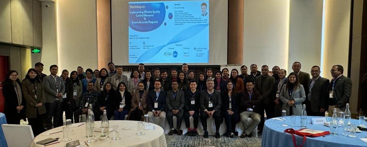 A one-day workshop on “Implementing Effective Quality Control Measures to Ensure Accurate Diagnosis” organized by the Bench to Clinic Research Center was held on 13th Dec, 2023 at Annapurna Hall, Hotel Vivanta in Kathmandu. Altogether 70 laboratory professionals from various academic and private institutions participated in this workshop.